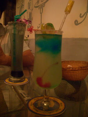 823砲戰是高梁加藍柑橘和鳳梨汁,老闆娘的解釋是砲彈在天上飛來飛去所以算是空戰(ㄟ?),所以是漂亮的藍色,杯口的鹽巴就是中共在可憐金門人的傷口灑鹽啦。 坑道是高梁加紫羅蘭酒跟檸檬汽水,黑黑的就像阿兵哥在幽暗的坑道裡掉淚啊 T_T