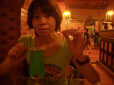 導覽結束後,又回到了模範街,淋了好一陣子的雨,於是我們到了吧薩這家小店休息。這家小店賣的是各式燒烤和調酒,調酒名稱都與金門或戰地有關,而且都是以高粱為基酒,很特別!而且都只要100元左右,好感動喔,在台北沒有兩三百元哪有調酒可以喝啊?